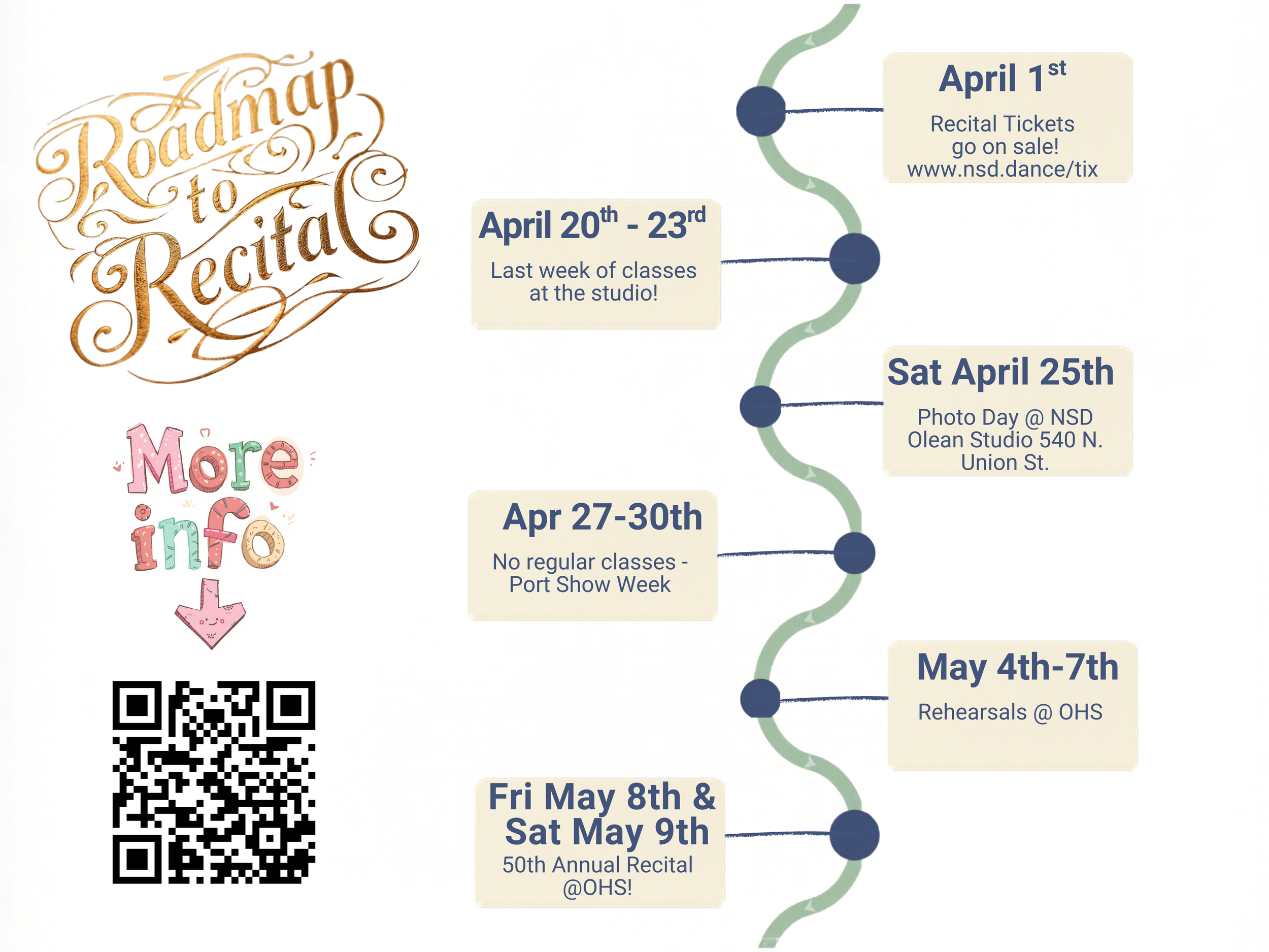 ALL rehearsals and the recital are both at Olean High School. Regular classes ARE NOT held the week of the recital.